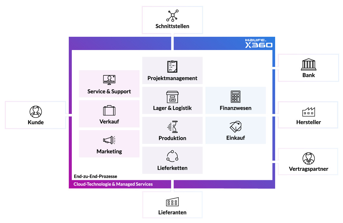 - Vollständige Integration mit allen Haufe X360 ERP-Modulen, einschließlich Buchhaltung und CRM