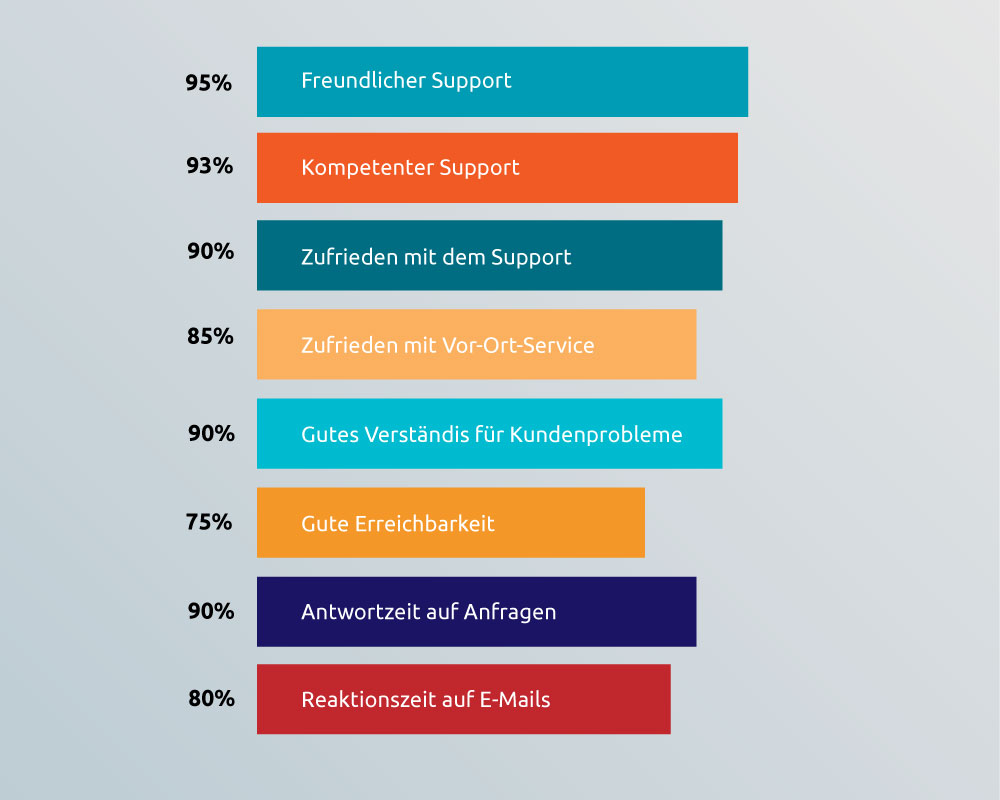 - 95% bzw. 93% beurteilten den Support als freundlich und kompetent und 90% der Befragten sind mit unserem Support zufrieden.