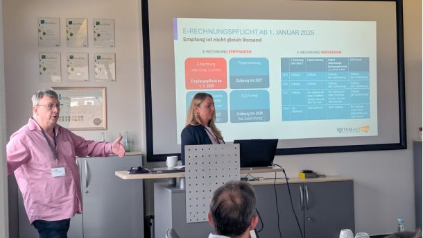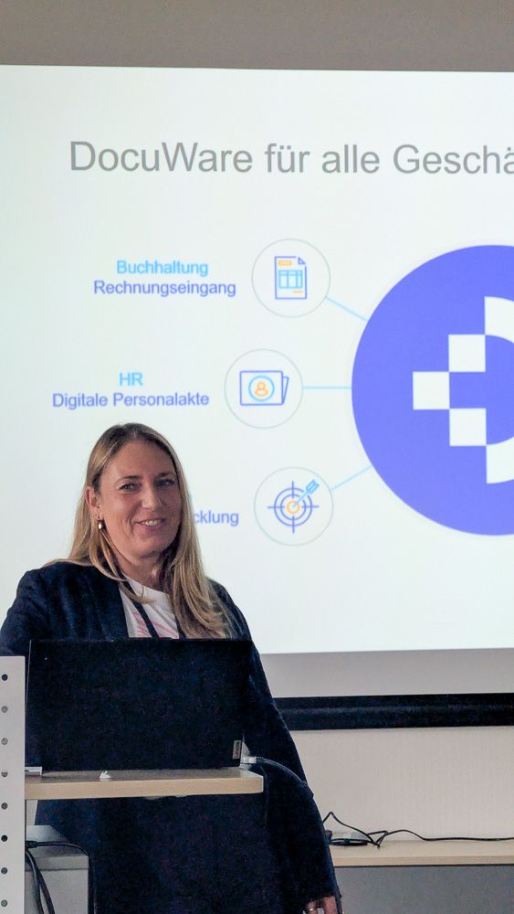 Unsere DMS- und DocuWare-Experten Sandra Schubert und Andreas Ruttkamp haben die Themen sehr verständlich aufgegriffen und anhand konkreter Praxisbeispiele gezeigt, wie eine smarte und zukunftsfähige Lösung mit dem DMS DocuWare in KMUs aussehen kann. Ein zentrales Thema dabei: Die E-Rechnung. Es entstand eher ein offenes Gespräch als ein Frontalvortrag.